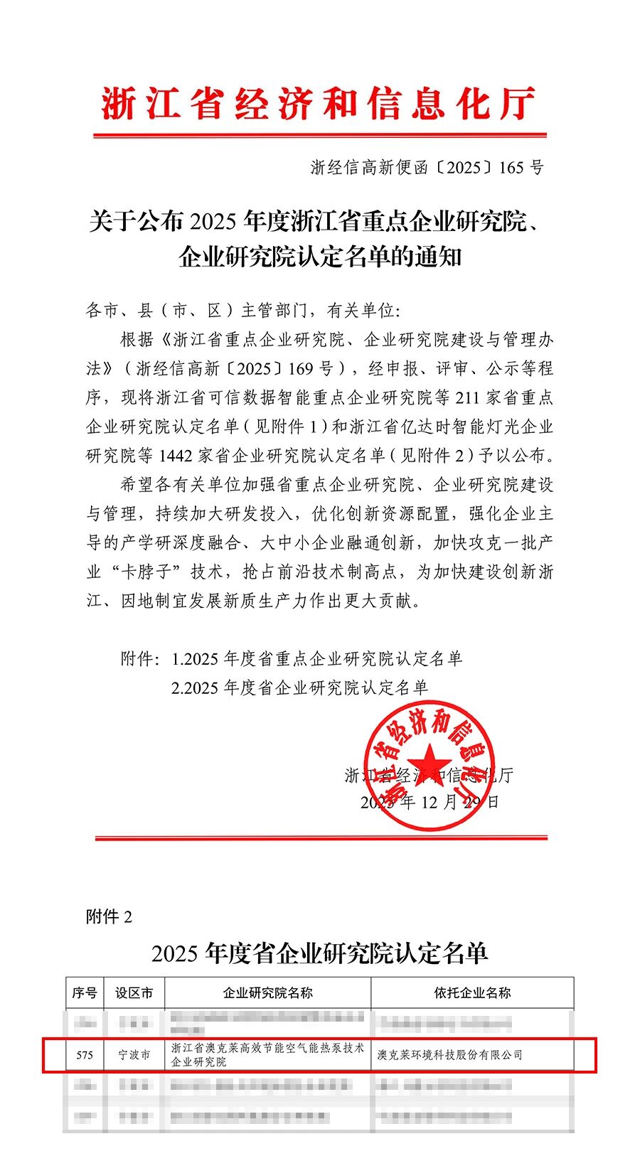 近日,浙江省经济和信息化厅正式发布2025年度省级企业研究院认定名单,澳克莱凭借在空气能热泵技术领域深厚的技术积淀与持续的创新实践,成功获批“浙江省企业研究院” 。