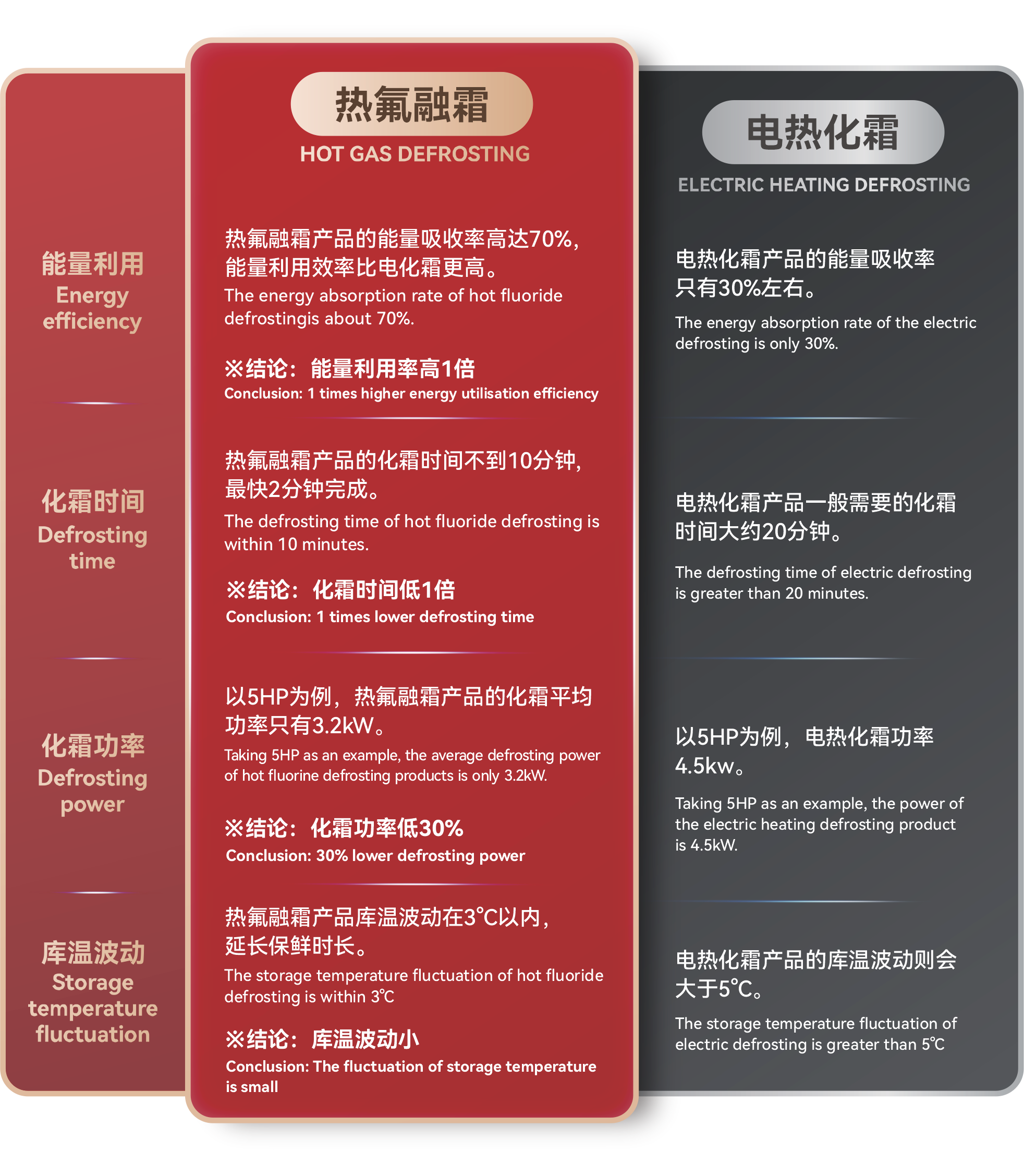 澳克莱AI变频冷库成套机组核心热氟融霜技术,利用压缩机排出的高温气体直接除霜。相比传统方式,热氟融霜更加省电,没有电热管烧毁的风险、也没有积水的烦恼,除霜过程库温波动小,尤其适合果蔬、鲜花、疫苗等对温度敏感的物品。