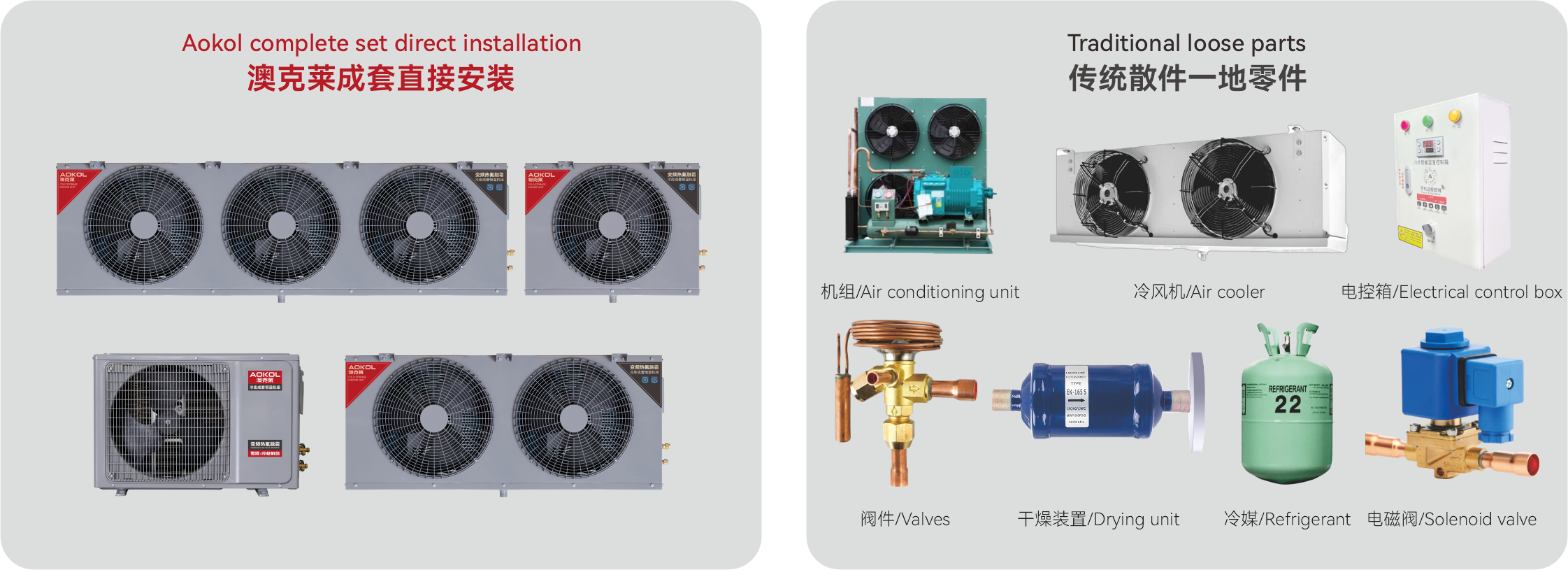 澳克莱冷库机组的核心,在于“成套设计”。每一套机组在出厂前,已完成各部件的参数调校与整机联动测试,安装时,现场只需连接管路和电源即可运行。